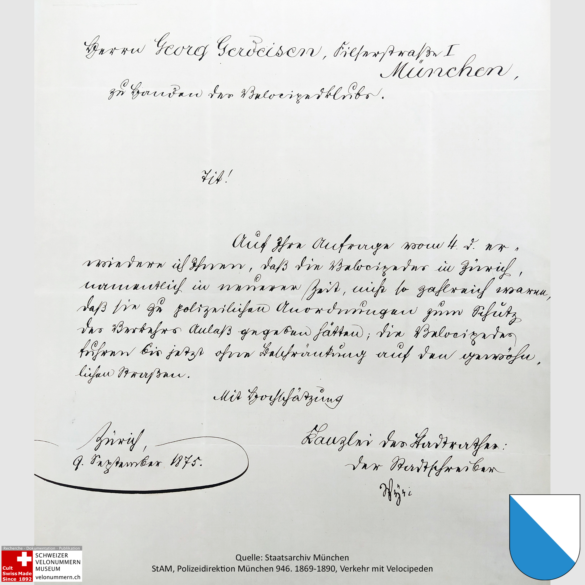 1875 Antwort aus Zürich auf Anfrage Velociped-Club München