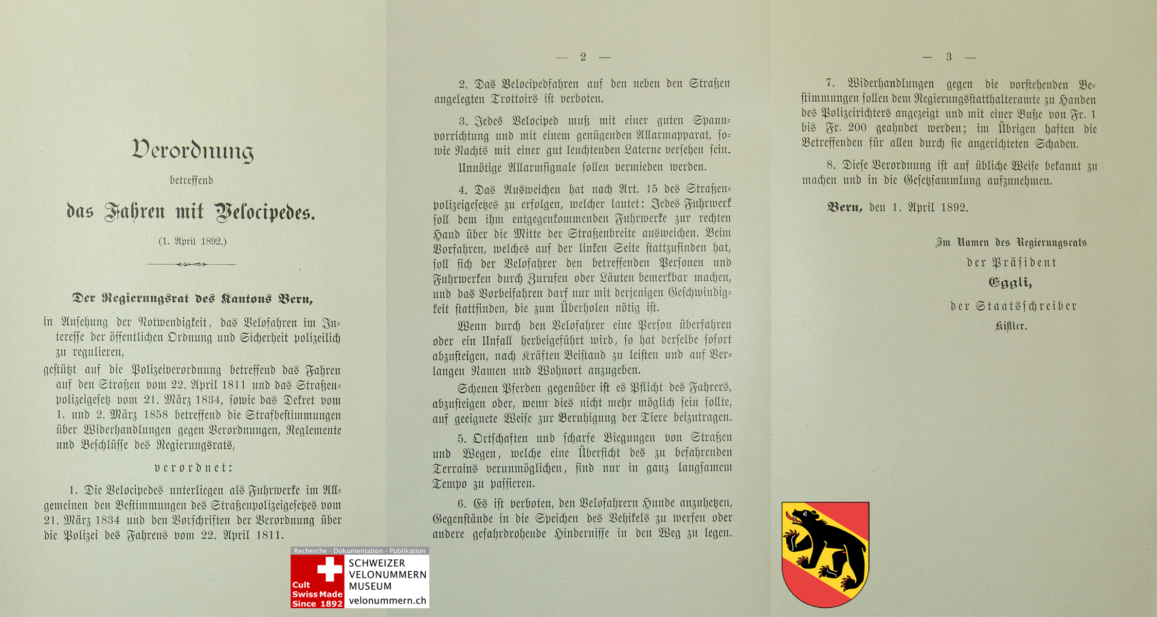 1892 BE Verordnung betreffend das Fahren mit Velocipedes