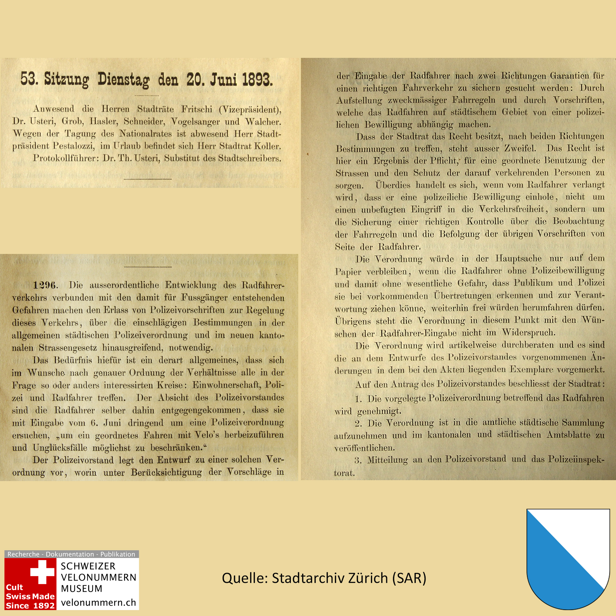 Der von den Velo-Klubs am 6. Juni 1893 eingereichte Vorschlag für eine Verordnung betreffend das Velofahren wird vom Zürcher Stadtrat nochmals überarbeitet und an seiner Sitzung vom 20. Juni 1893 als «Polizeiverordnung betreffend das Radfahren in der Stadt Zürich» kurzerhand und per sofort in Kraft gesetzt [DOKUMENT].