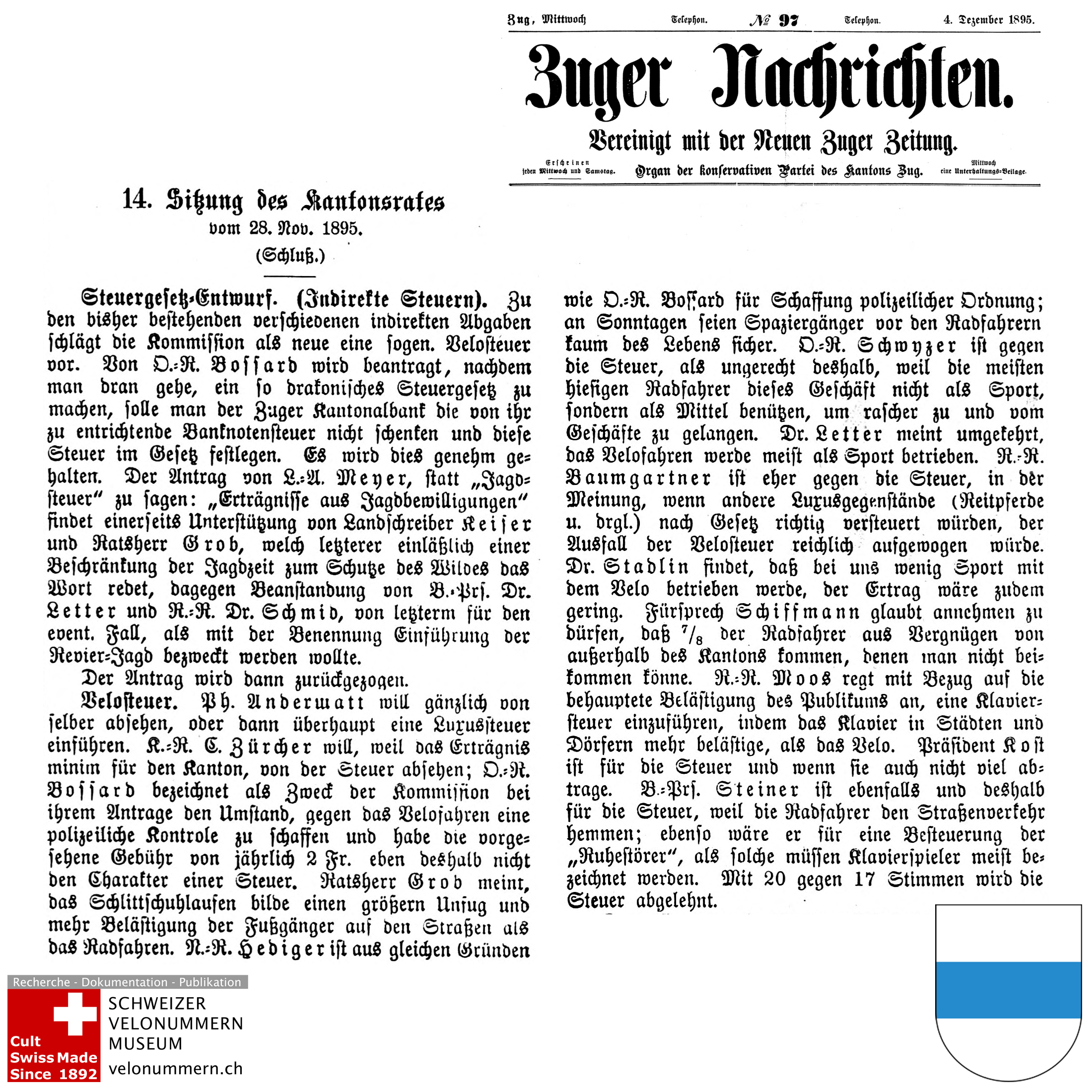 1895 ZG In Zug lehnt Kantonsrat Velosteuer und Velonummern ab