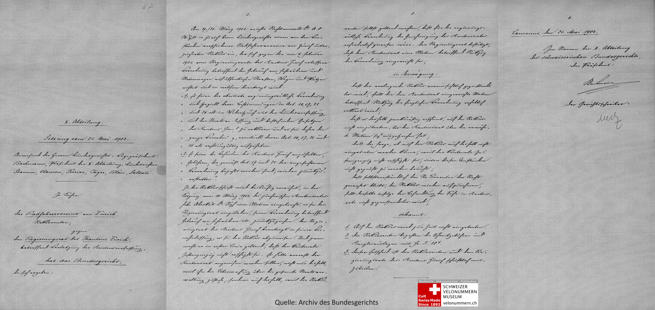 Am 31. Mai 1902 behandelt die II. Abteilung des Bundesgerichts in Lausanne unter dem Vorsitz von Bundesrichter Bachmann den Rekurs der Radfahrervereine aus Zürich gegen den Regierungsrat des Kantons Zürich bezüglich der am 6. Februar 1902 vom Regierungsrat erlassenen «Verordnung betreffend den Gebrauch von Fahrrädern und Motorwegen auf öffentlichen Strassen».