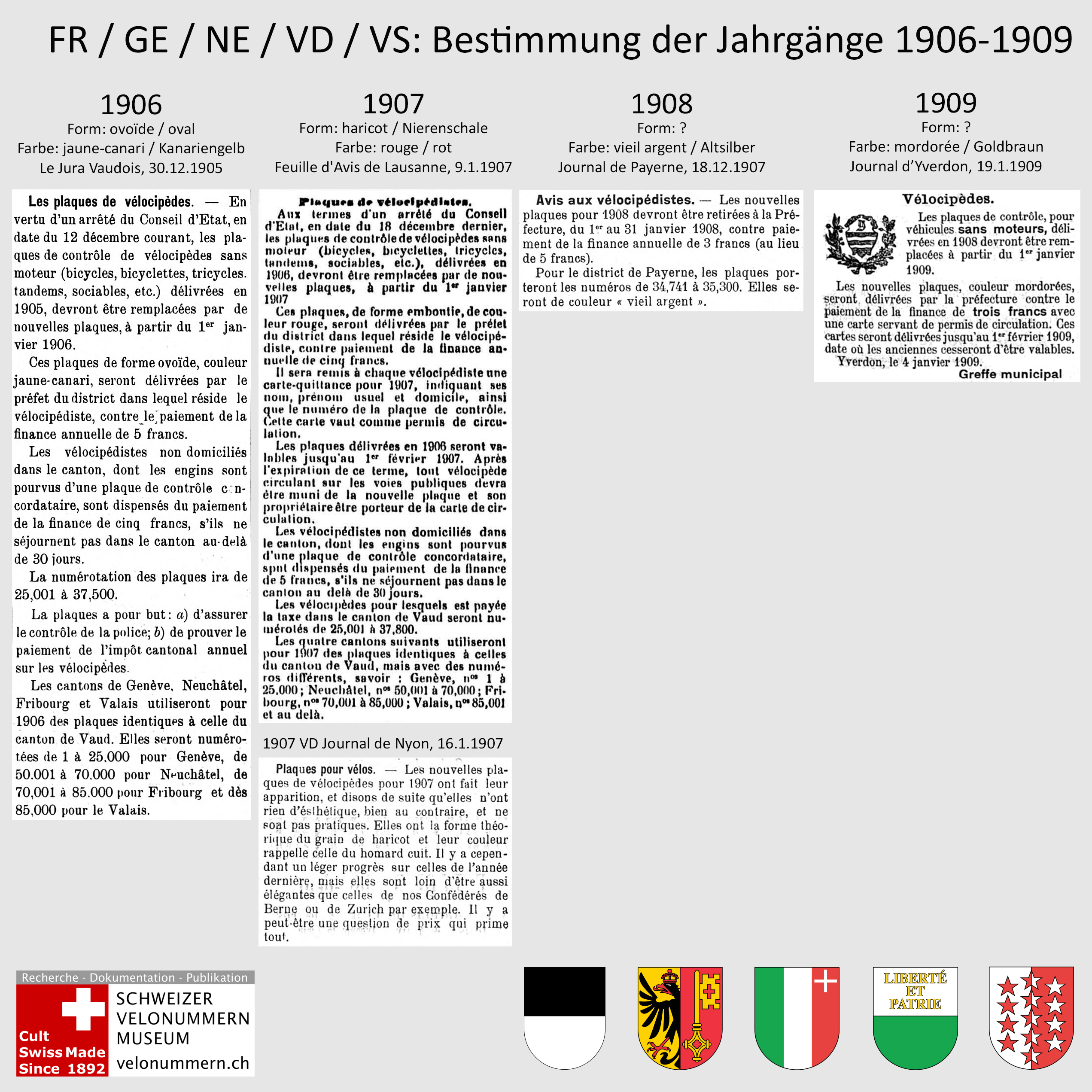 Unklar bleibt jedoch lange Zeit die Bestimmung der vier Jahrgänge 1906 bis 1909. In den Staatsarchiven haben wir dazu bisher nichts gefunden. Nun lässt sich die Bestimmung jedoch aus fünf verschiedenen Zeitungsartikeln ableiten, welche wir in einer Übersicht zusammengestellt haben. Sämtliche Artikel beziehen sich, was z.B. die Velo-Steuer angeht, zwar auf den Kanton Vaud. Form und Farbe der Kennzeichen sind jedoch für alle fünf Kantone identisch.