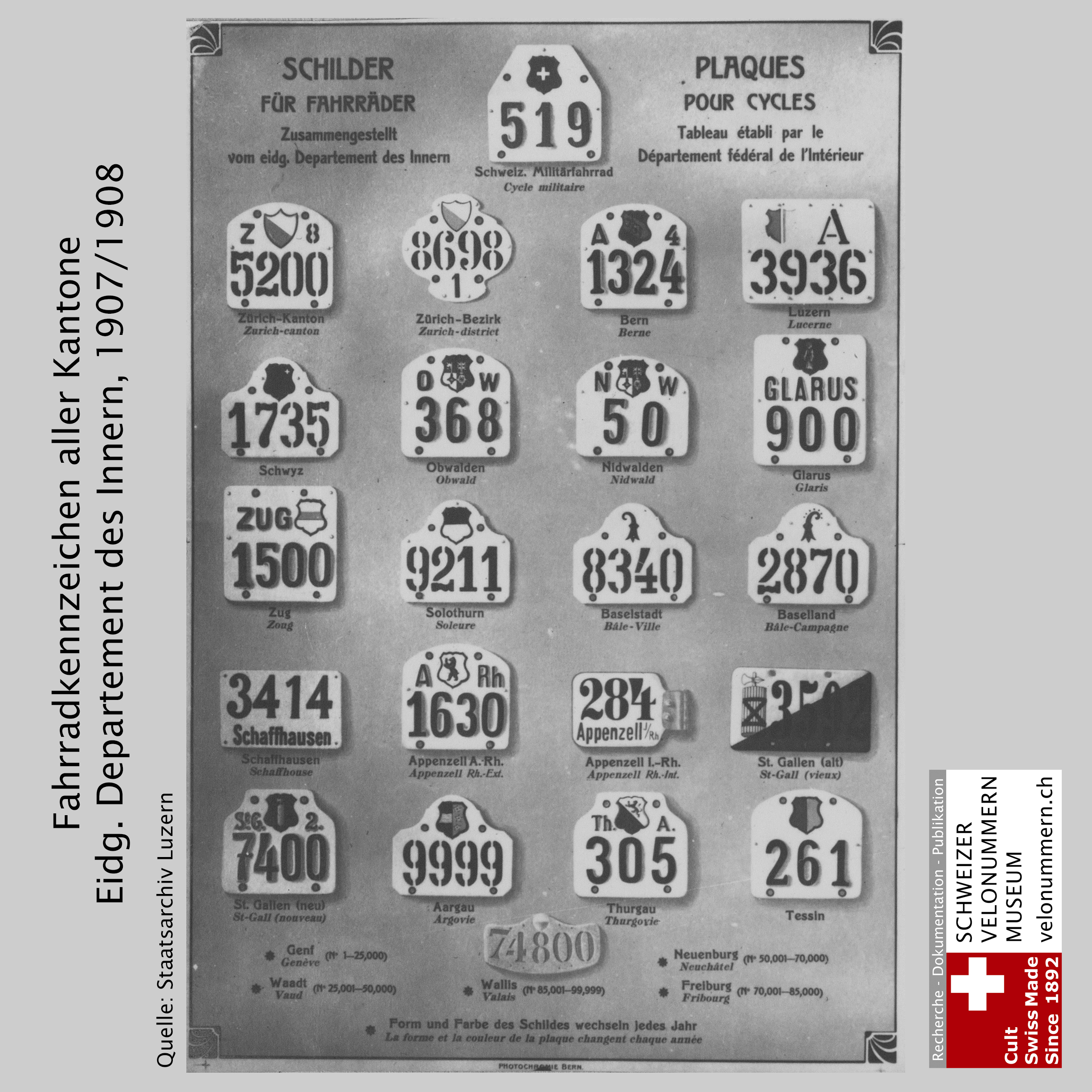 Am 23. April 1906 beschliessen die Konkordats-Kantone, beim Departement des Innern EDI die Erstellung einer Übersicht der Fahrradkennzeichen sämtlicher 22 Mitgliedskantone zu beantragen. Als wir davon gelesen haben, schlug unser Herz höher. Eine solche Übersicht wäre für alle Sammler und unser Museum der Stein für von Rosetta. Denn in dieser frühen Zeit haben die meisten Velonummern noch keinen Jahrgang für die Gültigkeitsdauer (siehe weiter oben). Aus diesem Grund ist bei zahlreichen Kennzeichen bis heute unklar, für welches Jahr sie gültig waren.