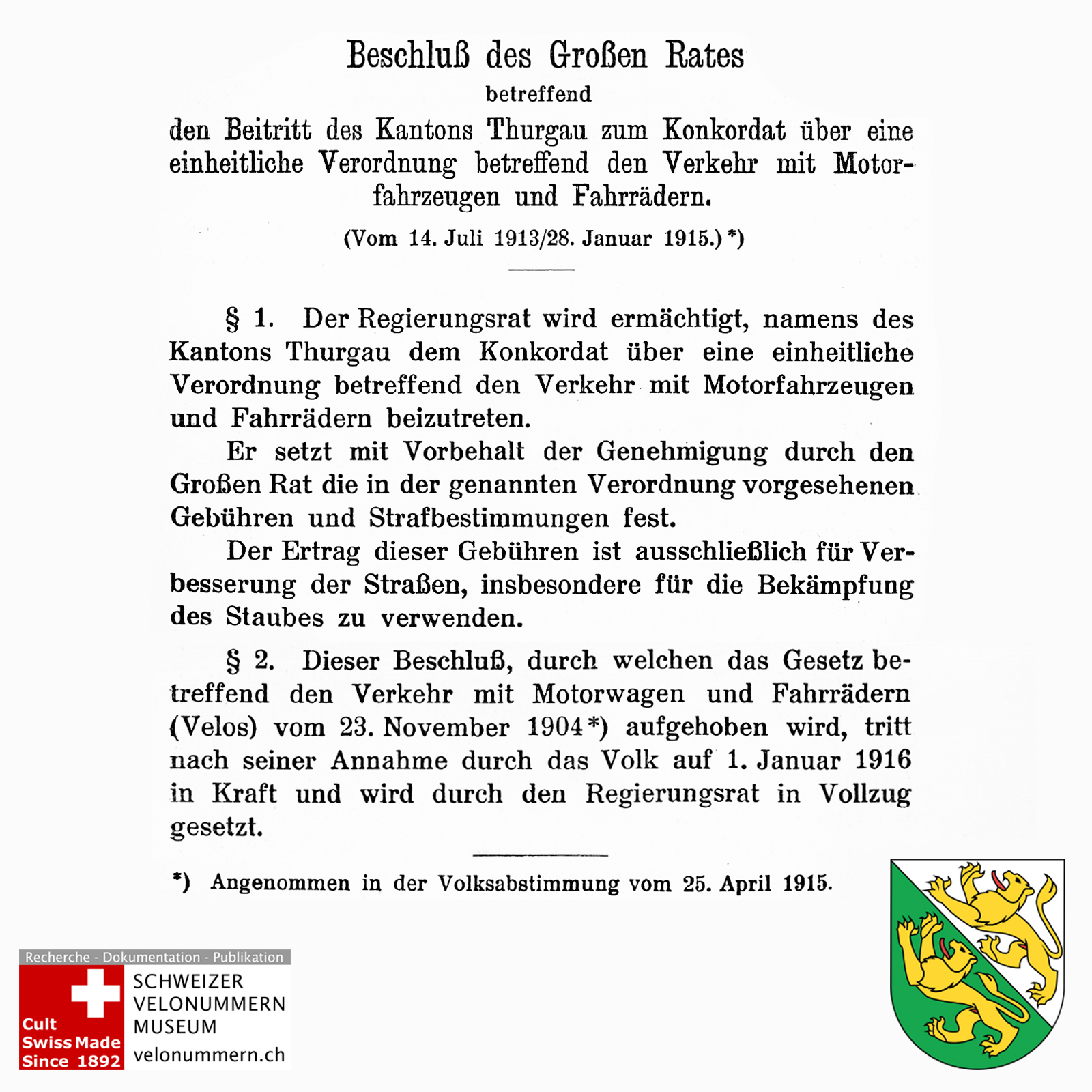 Da der Bundesrat das Konkordat bereits am 7. April 1914 genehmigt, wiederholt sich die Geschichte. Wie schon beim Konkordat von 1904 werden sämtlich Konkordats-Kantone in der Einleitung der Verordnung namentlich erwähnt. Einzig die Kantone Thurgau und Fribourg werden nicht erwähnt. Der offizielle Beitritt des Kantons Thurgau ist im Protokoll des Bunderats der 40. Sitzung vom 30. April 1915 dokumentiert.