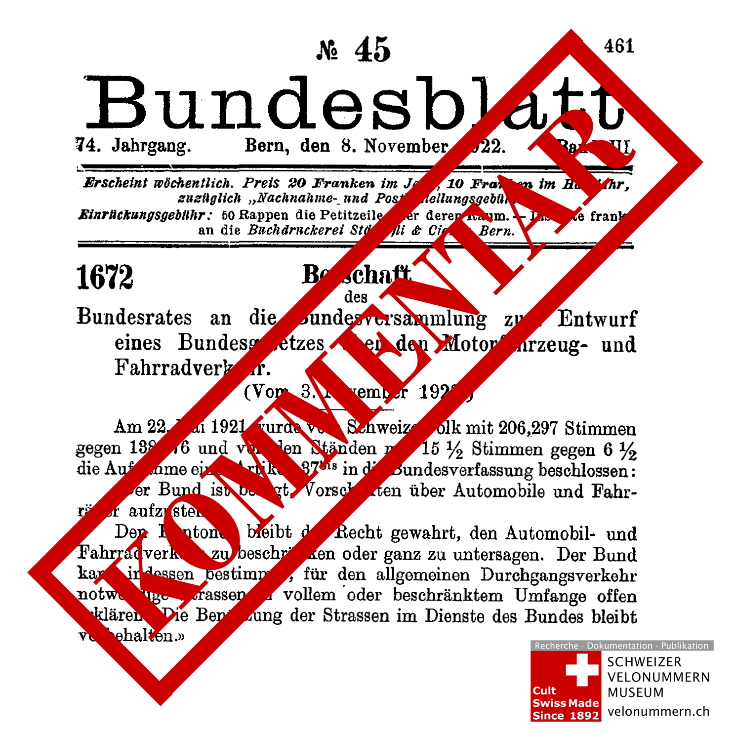 • Mai 1921: Die Aufnahme eines Artikels 37bis in die Bundesverfassung wird vom Schweizer Volk angenommen: «Der Bund ist befugt, Vorschriften über Automobile und Fahrräder aufzustellen»