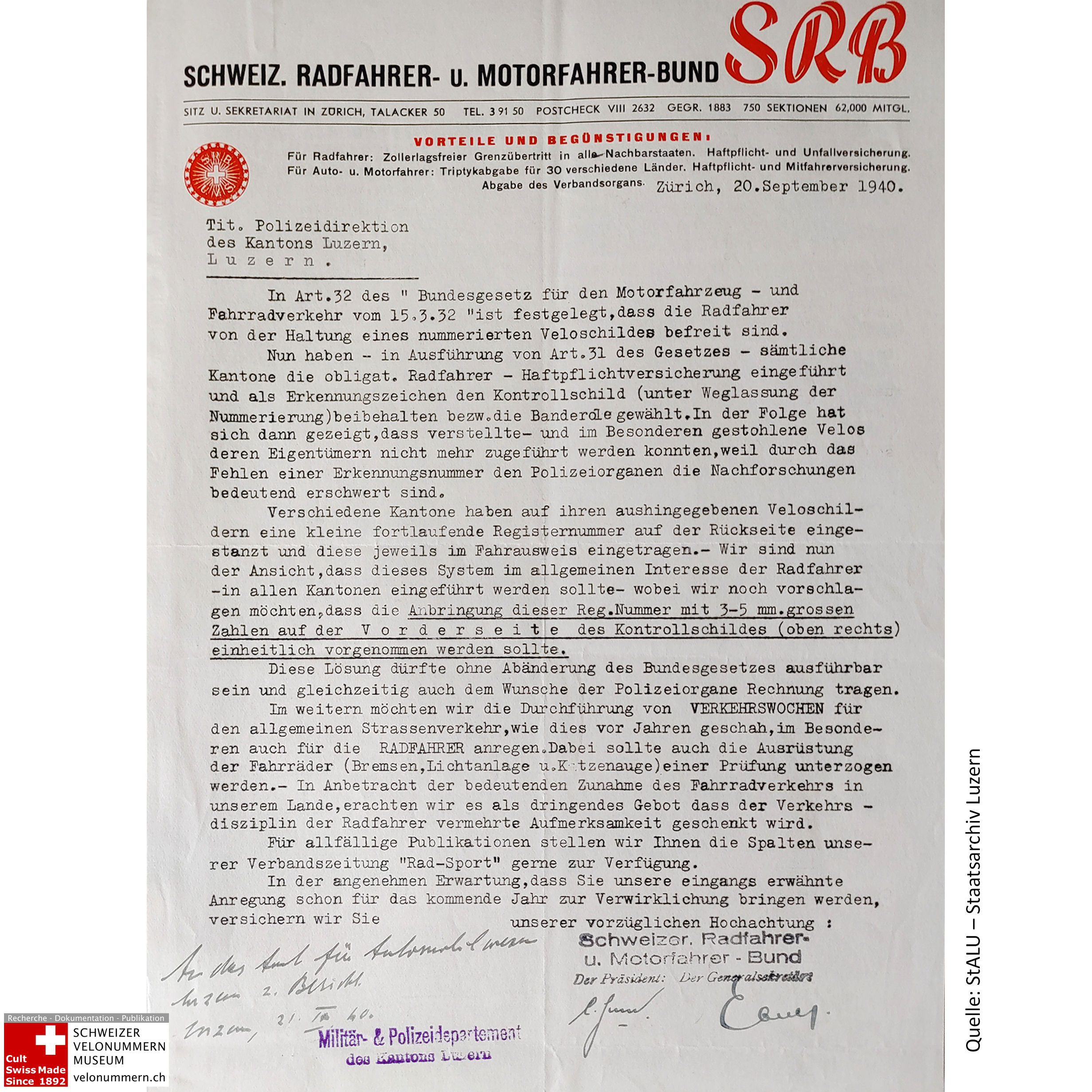 Gemäss Beschluss des Zentralkomitees schreibt der Schweizerische Radfahrer- und Motorfahrerbund SRB am 20. September 1940 sämtliche Kantone an, um diesen nach den Berichten in der Presse nun offiziell die Einführung einer kleinen Nummerierung auf der Vorderseite des Fahrradkennzeichens vorzuschlagen.