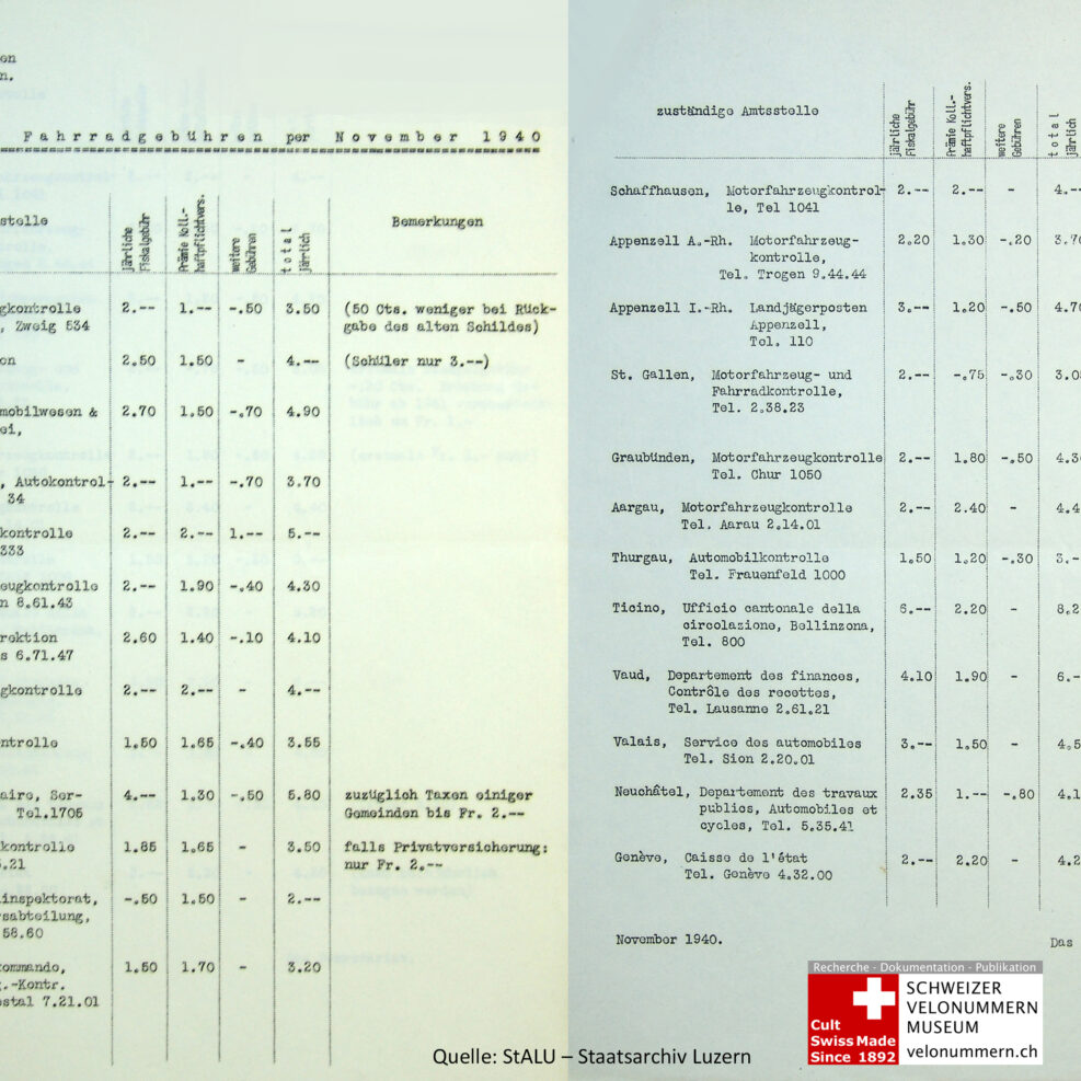1940 Gebühren für Fahrräder im kantonalen Vergleich