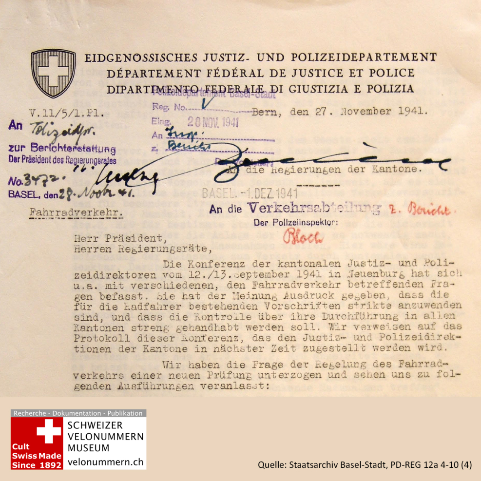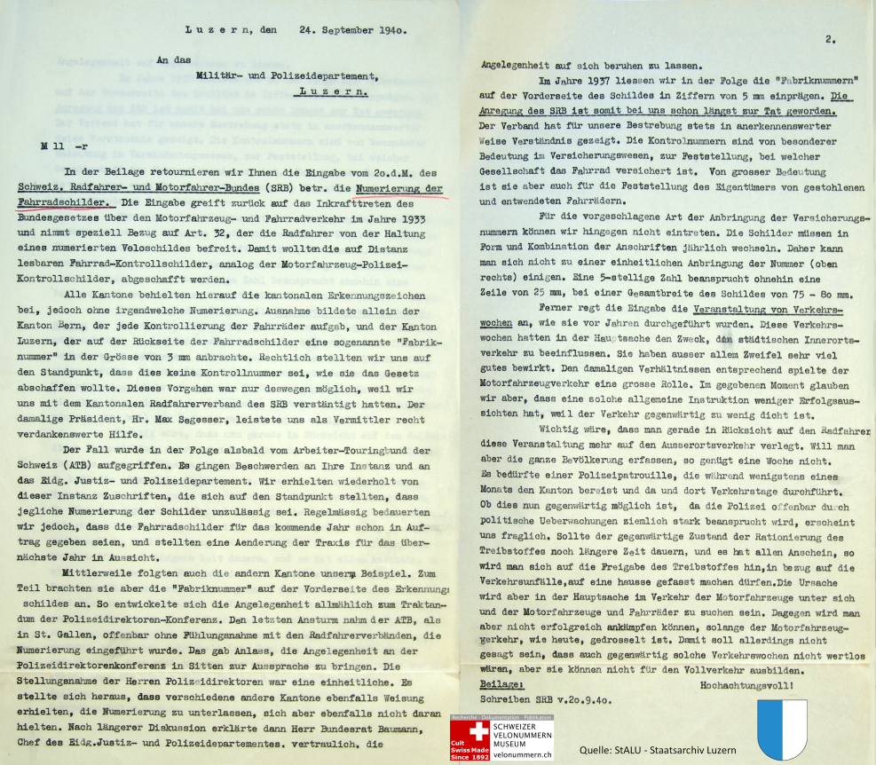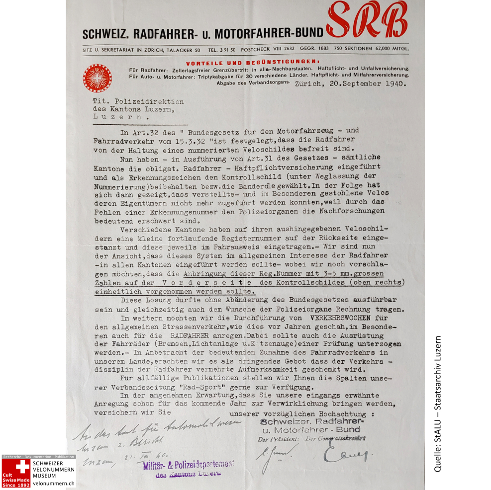 1940 SRB schlägt Kantonen Einführung der Velonummerierung vor