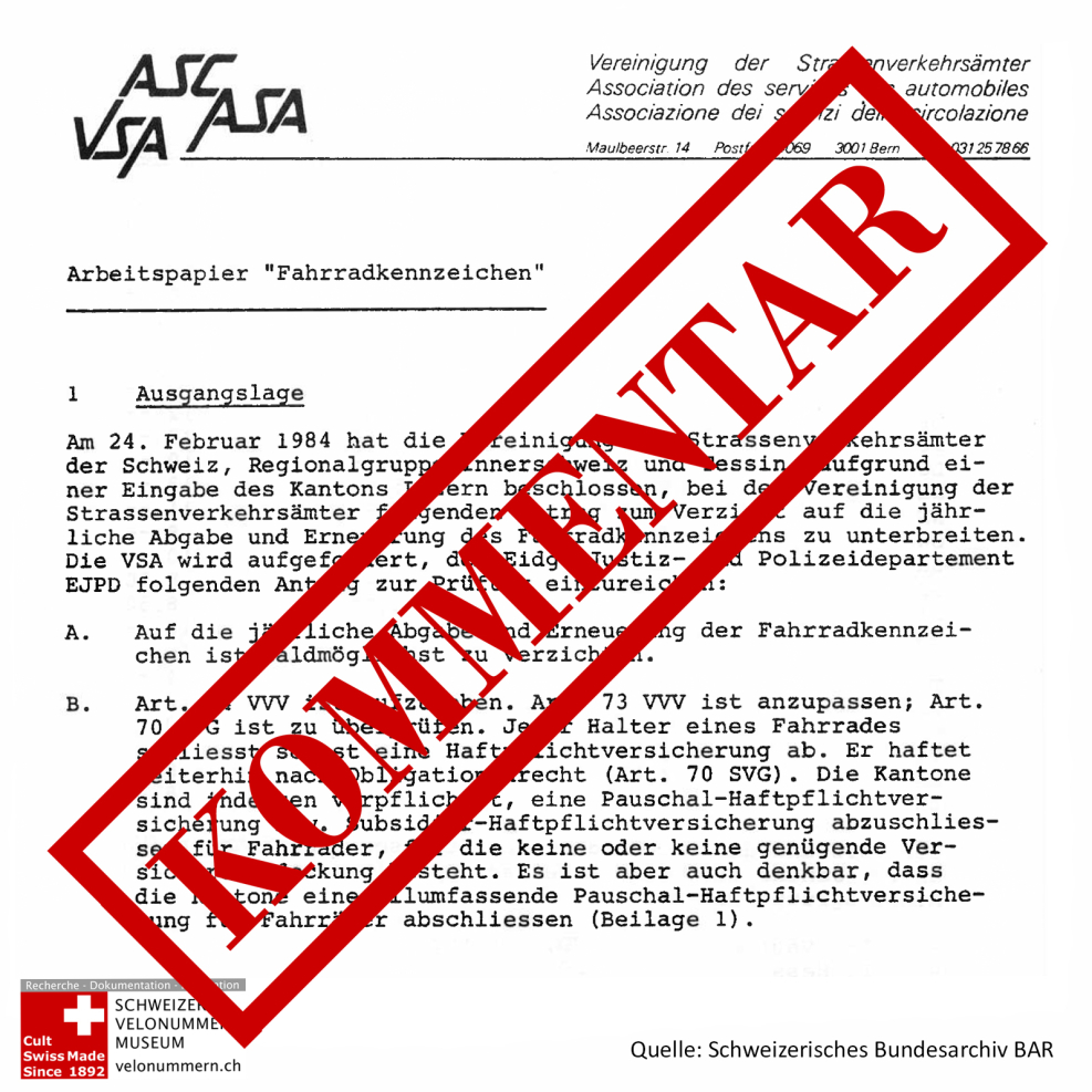 1986 Abschaffung Velonummern – Nachfrage beim Bundesrat