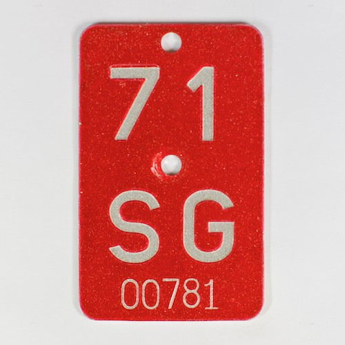 St. Gallen war der letzte Kanton, der diese grobkörnige Beschichtung für reflektierende Fahrradkennzeichen bis 1980 benutzte.